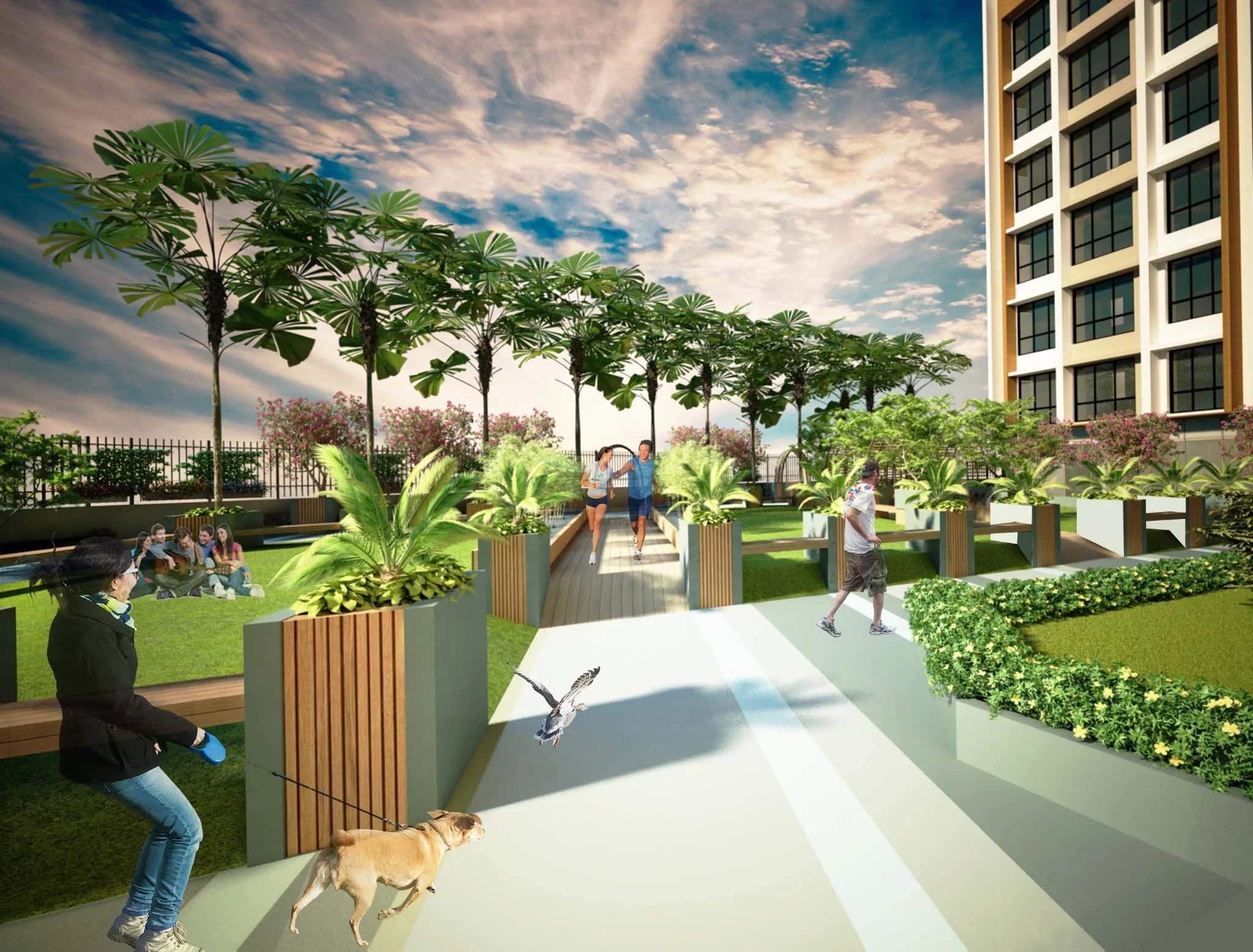 Gardens with stepped sit-outs and sloping greens at the Main Park at ground level, to the Sky Park with pathways lined with flowering trees 50 feet above ground, to the Rooftop Park where you can enjoy the panoramic Birds-eye view.